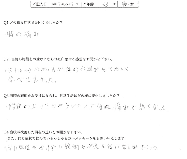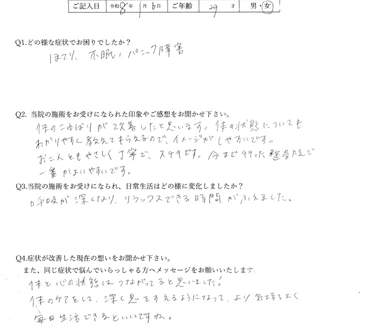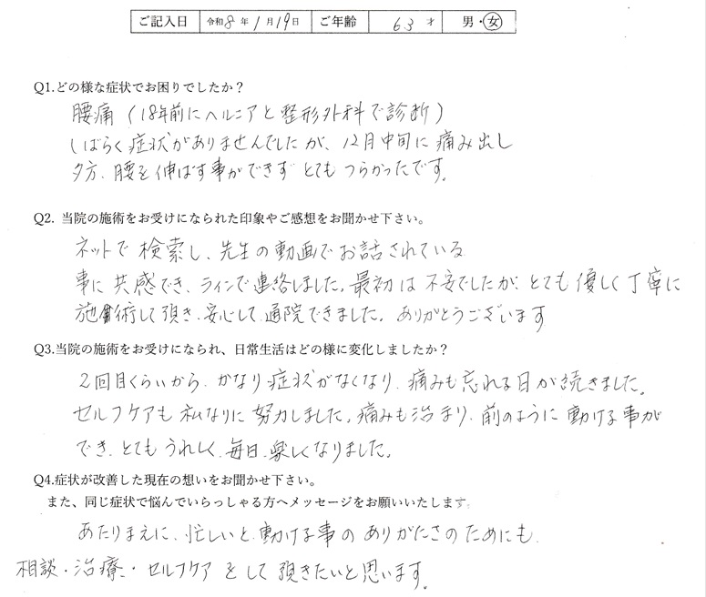 改善を諦めず、通院していただけたおかげで改善することができましたね。これからも一緒に再発予防に取り組みましょう。