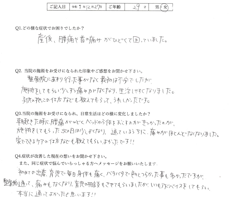 来院当初は痛みも強く、初めての子育てで不安もいっぱいだったと思います。