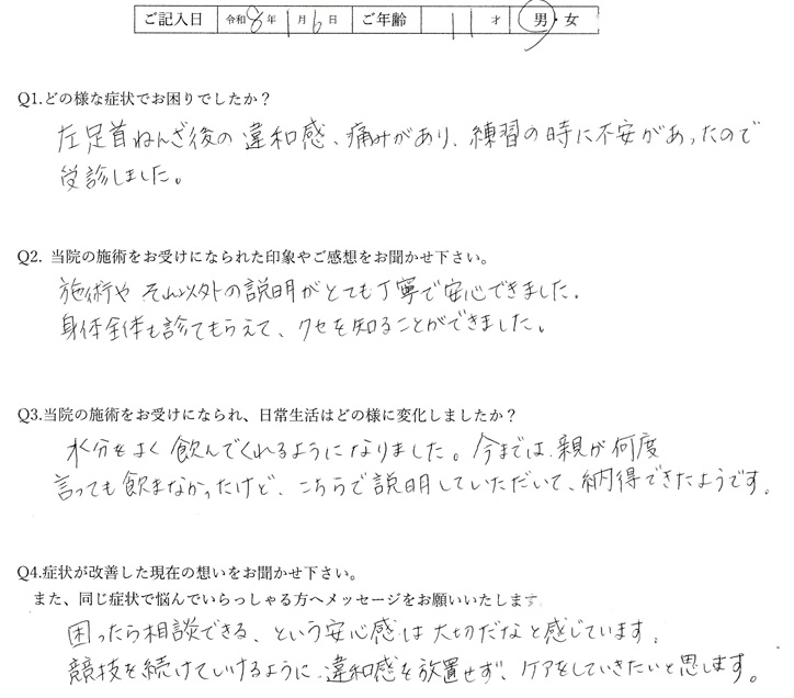 痛みで競技が満足にできないことはストレスですよね。今後も痛みを振り返さないように身体の使い方や姿勢を意識していきましょう!