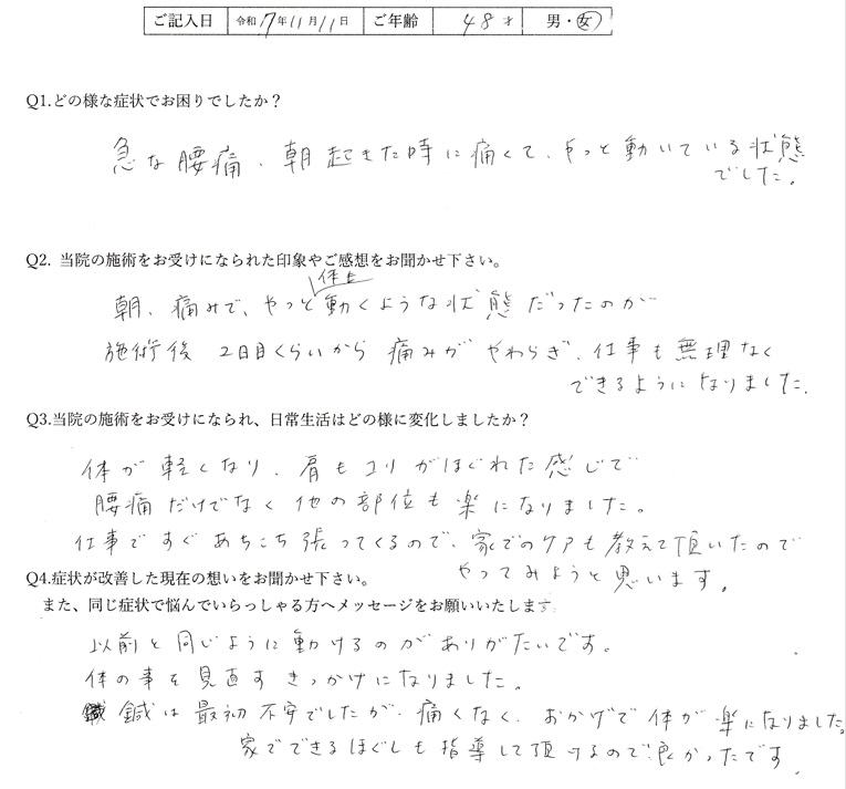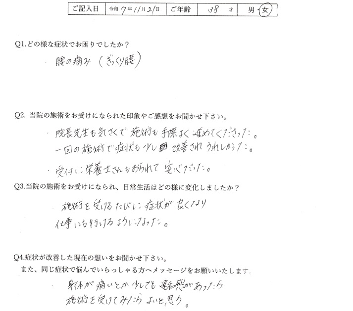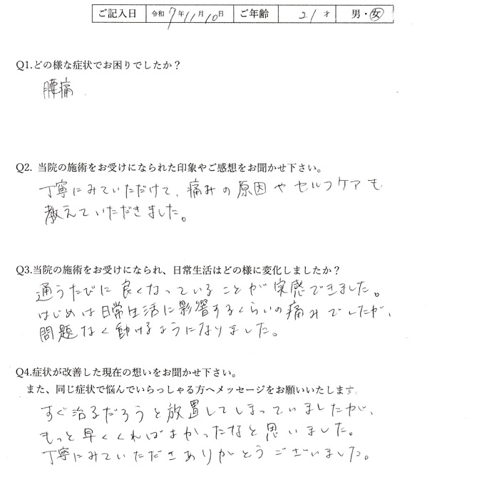 改善を諦めず、通院していただけたおかげで改善することができましたね。これからも一緒に再発予防に取り組みましょう。